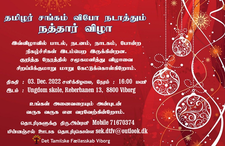 எதிர்வரும் 03-12-2022 மாலை 16 மணிக்கு ஆரம்பமாகும் நத்தார்விழா நிகழ்வில் நீங்கள் உங்கள் குடும்பம், உறவினர், நண்பர்கள் சகிதம் கலந்துகொண்டு சிறப்பிக்குமாறு கேட்டுக்கொள்கிறோம்.
